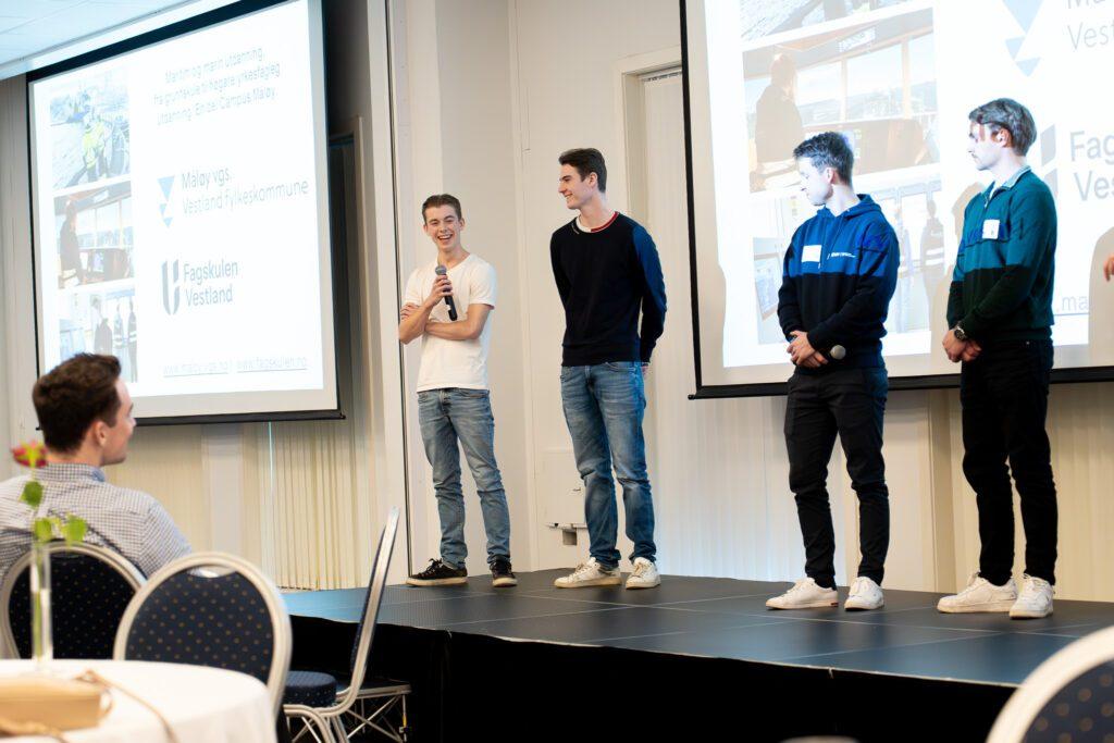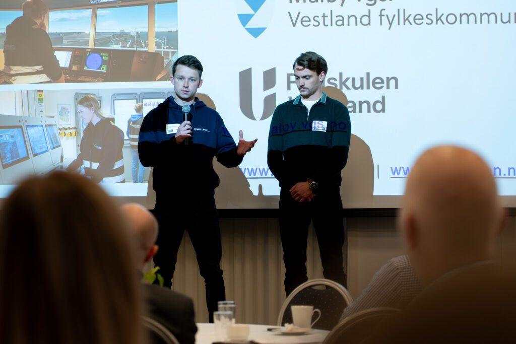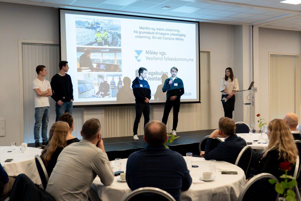 Mot slutten av programmet fekk dei unge sleppe til. Elevar frÄ MÄlÞy vidaregÄande og studentar frÄ Fagskulen Vestland fortalde kvifor dei har valt maritime utdanningar, og kva dei ser for seg av moglegheiter framover.